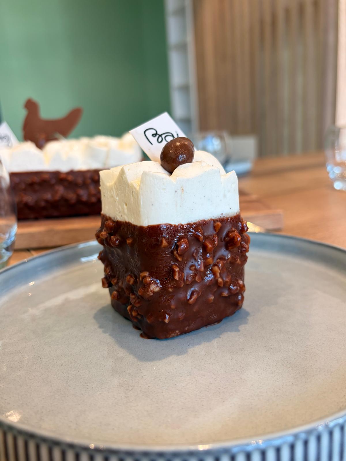 BISCUIT AUX AMANDES , POIRE EN COMPOTEE EMULSION VANILLE OUGANDA ET FONDANT CARAMEL.